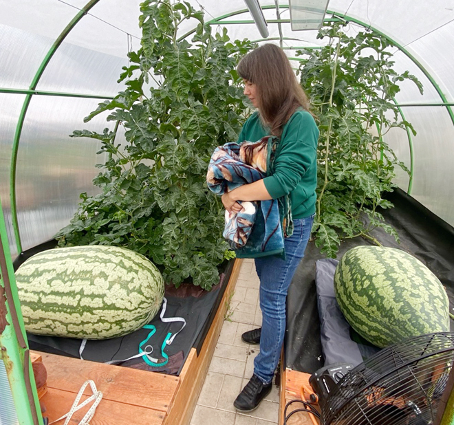 В теплице установлены датчики для наблюдения за корневой системой растений. Они показывают температуру, влажность грунта. Над растениями установлены инфракрасные обогреватели - чтобы исключить резкие перепады температурных режимов и вырастить гигантов, Каролина соблюдает в теплице определённый режим. - Благодаря инфракрасным обогревателям у меня в бочках всегда тёплая вода. В ночное время работает терморегулятор, который настроен на 20 градусов независимо от температуры за окном. Есть ещё подогрев грунта, в него закопан термокабель, который поддерживает температуру в 23 градуса. Выращивание гигантских овощей и ягод - тяжёлый физический труд и дисциплина. Растения, как и домашние питомцы, требуют большого внимания. Летом Каролина вставала каждое утро в шесть утра, чтобы совершить обход. Также гигантские культуры требуют хорошего полива. Например, только на один куст арбуза в день Каролина выливала по семьдесят литров воды, а в теплице их два. - Джон у нас маленький, - говорит Каролина. - Вот Халид имеет расчётный вес в 94 килограмма.