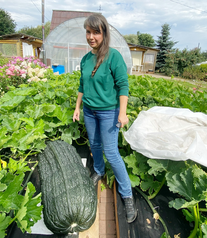- Чем дольше кабачок лежит на кусте, тем сильнее грубеет кожура. Он покрывается бородавками, благодаря этому сорт назван Marrow - потому что похож на костный мозг. Семена у него ценные, этот кабачок - потомок чемпиона, который занял второе место в мире. Его вес был свыше ста килограммов. Это его «сын», получается. Генетика очень хорошая. Поэтому мне нужны с него семена и я долго держу его на грядке. Другие два плода от раннего сорта кабачка мы уже разрезали, забили ими морозильную камеру и наготовили оладушек. Первый гигант-кабачок Гена весил 31,5 кг, второй 38,8 кг. Все свои культуры Каролина регулярно обследует, фиксирует все изменения. - С какими культурами хотелось бы поэкспериментировать дальше? - Хочется вырастить гигантский лук-порей, но никак не могу найти семена. Не получается уже второй год. Видела, что он выращивается не семенами, а рассадой. При выращивании гигантов важны не только сами семена, но и технология ухода. Например, если посадить сорт гигантского арбуза и не ухаживать за ним как следует, гиганта не будет. У вас вырастет обычный плод на 15-20 килограммов. - Будет ли возможность прибрести семена ваших растений? - Добыть семена гигантов в России очень сложно. Очень мало гроверов - тех, кто выращивает гигантские овощи. Я знаю практически всех гигантоводов. У нас в чате их около 80 человек. Поэтому мы обмениваемся или продаём друг другу семена. Наперекор общественному мнению - Выращивать гигантские овощи очень интересно, хотя скептики утверждают, будто овощи у нас огромные из-за полива химией, но это не так. В тех растениях, что мы сажаем, генетически заложен гигантизм, и вместе с правильной агротехникой мы и добиваемся высоких результатов. Мы не боимся и сами едим все плоды, поскольку знаем, на чём выращены культуры. Подсолнухи тоже съедим. Несъедобный у меня только огурец, потому что горький. Я его выращиваю на семена, таких семян в России очень мало. - Помню, у вас была традиция под Новый год выращивать арбуз и содержать домашний зимний огород. Повторите в этом году? - После сезона хочется отдохнуть. Наверное, полноценно заниматься домашним огородом не будет времени. Растения хоть и любимые, но всё равно выматывают. Ну, может, томат и огурец просажу. ЦЕЛИ НА БУДУЩИЙ СЕЗОН - Цели на будущий сезон - приобрести семена с рекордсмена этого года, с подмосковного арбуза, и вырастить его. Также буду обмениваться на семена гигантского томата. Отправлю девушке семена кабачка, а она мне томаты. На мои семена суперподсолнухов тоже уже много желающих. КОГДА В КОНЦЕ СЕЗОНА ВИДИШЬ ДОСТИЖЕНИЯ - Я рада, что удалось побить свой рекорд по подсолнухам. Мне нравится эта гонка, мы среди энтузиастов соревнуемся. Пока меня никто не может обойти. И это награда для себя лично. Оценивая труд в конце сезона, если все получилось, ты понимаешь, что вырос и стал ещё на ступень выше в своих трудах. Очень важна агротехника, с каждым годом что-то новое открываешь. Информации мало, приходится по крупицам собирать, своим опытом достигать. МЕЧТЫ ИЗ ОГОРОДА ГИГАНТОВ - Хочу арбуз в сто килограммов! Вот к этой мечте и иду, через трудности, через неудачи. Был год, когда у меня гиганты вообще не выросли. Поэтому ещё раз подчеркну, что разведение гигантов - большой риск. Можно купить дорогую семечку, посадить и у тебя ничего не вырастет. Но я люблю своё хобби и верю в то, что делаю. Пускай всё