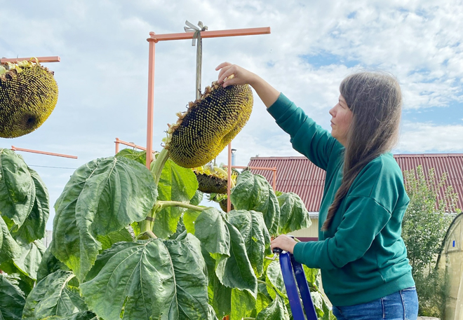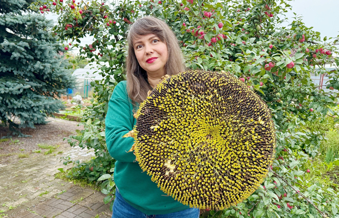 - Высота, конечно же, всех впечатляет, но она не главный показатель. Главное, чтобы ствол рос вширь и смог удержать корзинки. Ведь чем он жирнее, тем корзина крупнее. В прошлом году мой результат по подсолнухам в 54 сантиметра был лучшим в России. В этом году, несмотря на сырое лето мне всё-таки удалось вырастить корзину размером 70 см от края до края. Полностью вызревших семян в корзинках мало, много пустых попадается. Виной тому плохое опыление. Когда они цвели, была дождливая погода, возможно, это повлияло. Моя задача теперь высушить семена и проверить их на всхожесть.