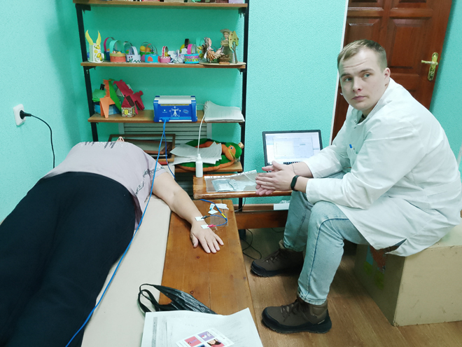 В день 7 ноября Центр досуга посёлка Комсомольского стал местом притяжения людей, которые заботятся о своём здоровье - Кунгурская больница проводила здесь День здоровья. В посёлок прибыла бригада из 20 человек, в составе которой были 12 медицинских работников и 8 добровольных помощников - волонтёры Прикамья и студенты сестринского отделения КЦО. Каждый выполнял свою работу: медики занимались исследованиями, волонтёры встречали людей, раздавали флаеры, помогали заполнять анкеты. На подходе к Центру досуга был установлен передвижной флюорограф, в разных кабинетах расположились пункт забора крови, ЭКГ, врач-терапевт, медсестра офтальмолога. Особое внимание привлекла новинка Кунгурской больницы - прибор Биоимпедансметр. - Биоимпедансометрия - это метод диагностики состава тела человека, - объяснила заместитель главного врача Елена Калимуллина. - Прибор позволяет выявлять скрытую внеклеточную жидкость, которая проявляет себя в скрытых отёках. Когда это выявляется, человеку назначается специальное лечение, в результате которого снижается вес и уходят отёки. У кого-то может быть выявлен избыток висцерального, то есть, лишнего жира. На основании этого мы рассчитываем суточную норму килокалорий, чтобы постепенно и без вреда для организма снижать количество этого жира.