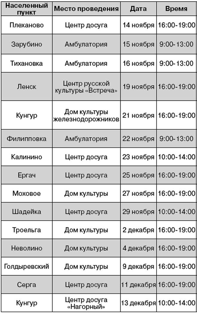 - Это была наша первая проба в проведении Дней здоровья, которая показала достоинства такого мероприятия и выявила некоторые недоработки, - сказала, подводя итоги первого Дня здоровья, Елена Калимуллина. - Мы обязательно все проанализируем и учтём это при подготовке следующих таких мероприятий. А всем участникам прошедшего Дня здоровья напоминаю, что им необходимо побывать на приёме у фельдшера Комсомольской амбулатории, чтобы узнать результаты проведённых исследований и получить рекомендации. В дальнейших планах Кунгурской больницы - регулярное проведение Дней здоровья по всему округу. Не упустите возможность сделать День здоровья шагом к здоровой жизни! Евгения Берклунд График проведения Дней здоровья в Кунгурском округе в ноябре-декабре 2025 года